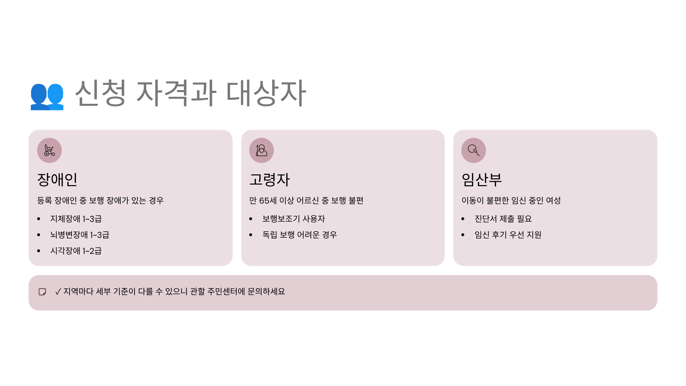 지역별로 특별 대상자 제도도 운영되고 있어요. 서울시는 '나드리콜' 서비스를 통해 국가유공자 중 상이등급 1~2급 해당자도 이용할 수 있게 했고, 부산시는 희귀 난치질환자도 포함시켰어요. 경기도는 발달장애인의 통학 지원을 위한 별도 프로그램을 운영하고 있답니다. 각 지자체 홈페이지에서 자세한 대상자 기준을 확인해 보세요!