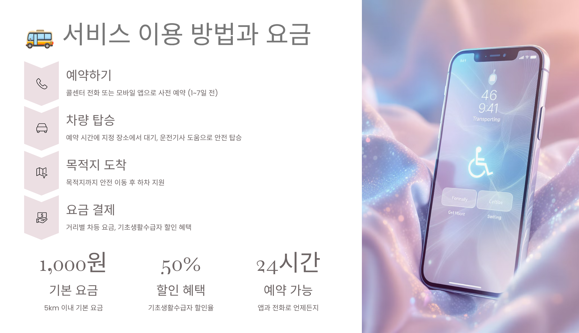 교통약자 이동지원 서비스가 승인되면 본격적으로 이용할 수 있어요. 차량 예약은 크게 즉시콜과 예약콜로 나뉘는데, 즉시콜은 30분~1시간 이내 바로 이용하는 것이고, 예약콜은 하루 전부터 최대 7일 전까지 미리 예약하는 방식이에요. 병원 진료나 중요한 일정이 있을 때는 예약콜을 이용하는 것이 확실하답니다. 즉시콜은 차량 상황에 따라 대기 시간이 길어질 수 있어요.