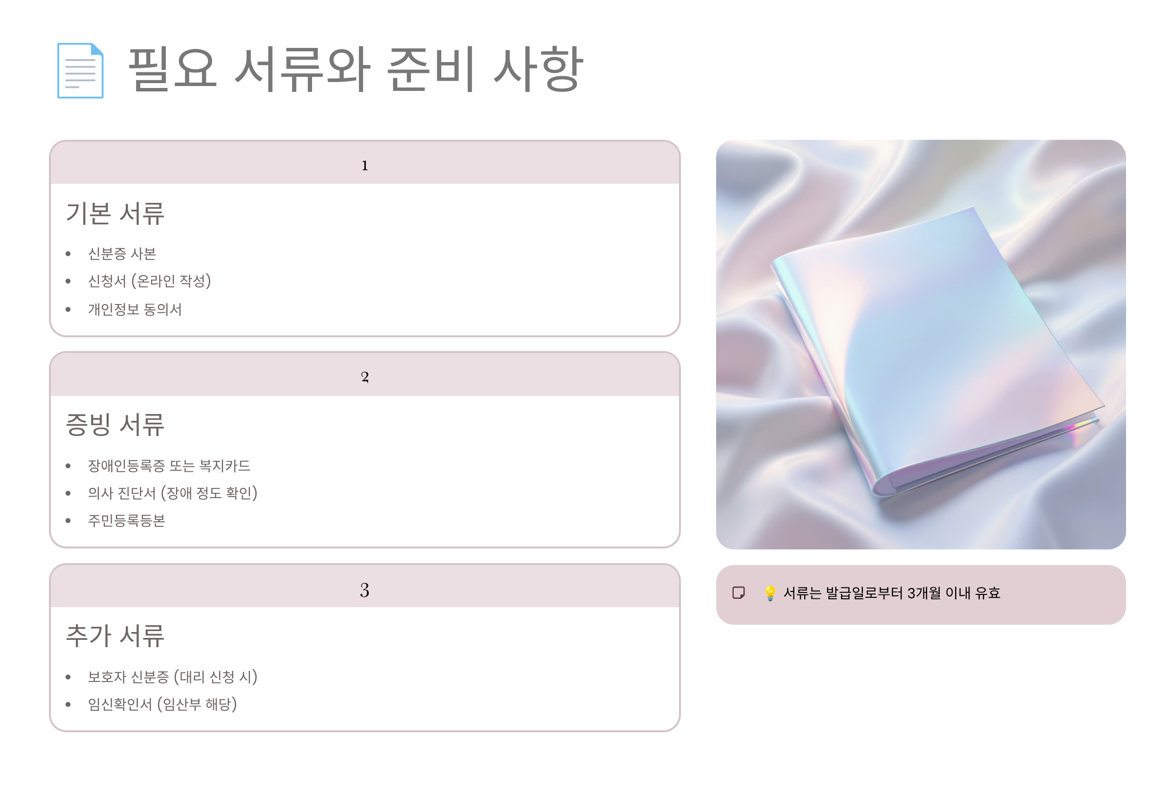 서류 준비 시 주의사항도 있어요. 모든 서류는 최근 3개월 이내 발급된 것이어야 하고, 주민등록번호 뒷자리는 가려서 제출해도 괜찮아요. 온라인 제출 시 파일명은 '홍길동_장애인등록증' 같은 형식으로 본인 이름과 서류명을 함께 적어주면 처리가 빨라진답니다. 사진 파일의 경우 너무 어둡거나 흐릿하면 재제출 요청을 받을 수 있으니 밝은 곳에서 선명하게 촬영해 주세요.