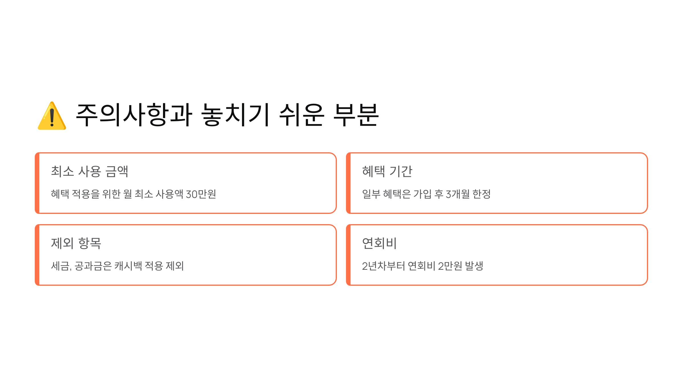 연회비 면제 조건도 잘 확인해야 해요. 첫해는 무조건 면제지만, 다음 해부터는 전년도 300만 원 이상 사용해야 면제돼요. 이 조건을 충족하지 못하면 3만 원의 연회비가 청구되니 미리 계획을 세워두세요.
