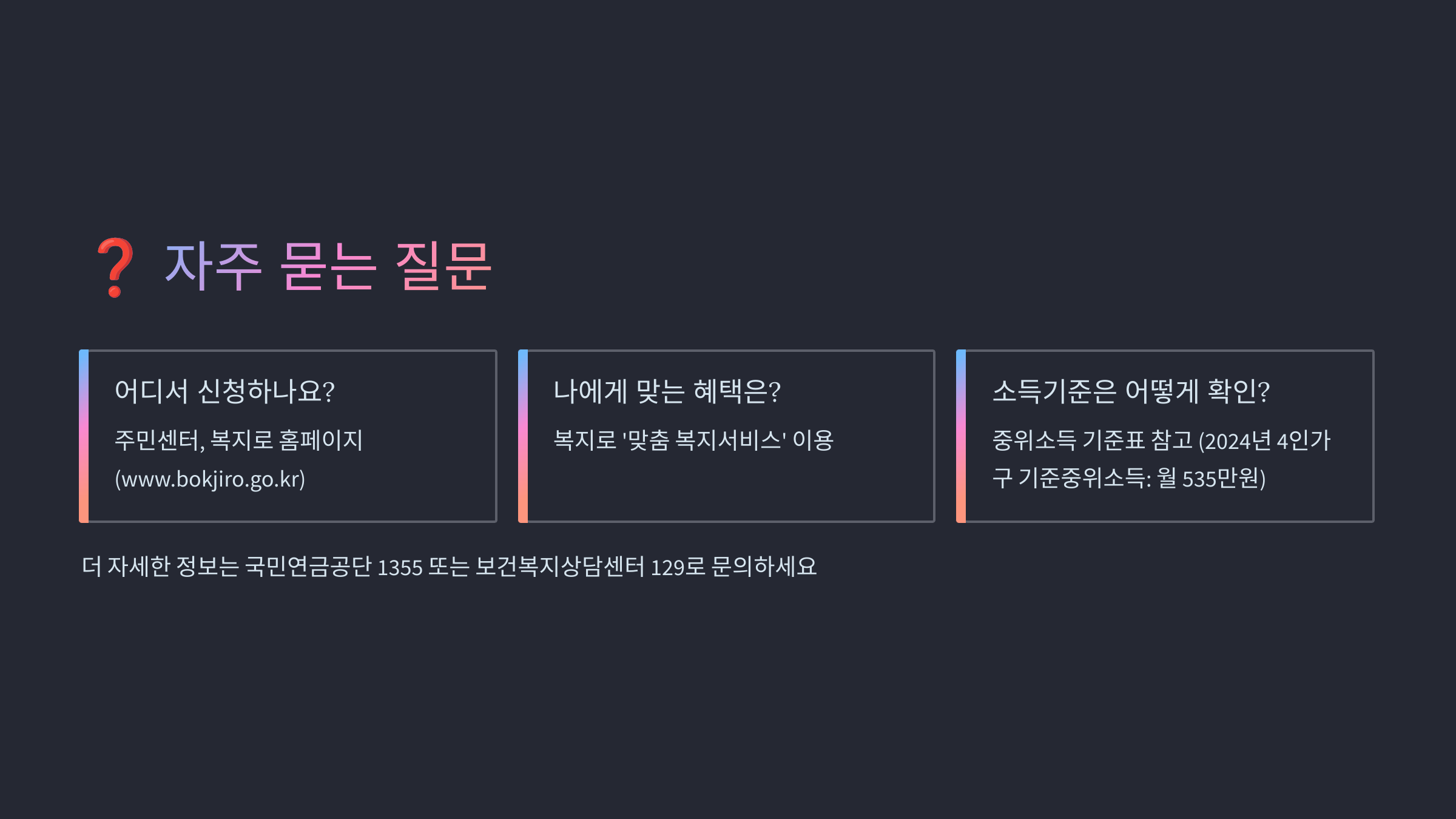 A2. 복지로 홈페이지나 앱에서 '복지서비스 모의계산'을 통해 확인할 수 있어요. 가구원 수와 월 소득을 입력하면 중위소득 대비 몇 % 인지 자동으로 계산해 줍니다. 2025년 기준 4인 가구 중위소득은 월 579만 원이에요. 주민센터에 방문하셔도 상담사가 친절하게 계산해 드린답니다!
