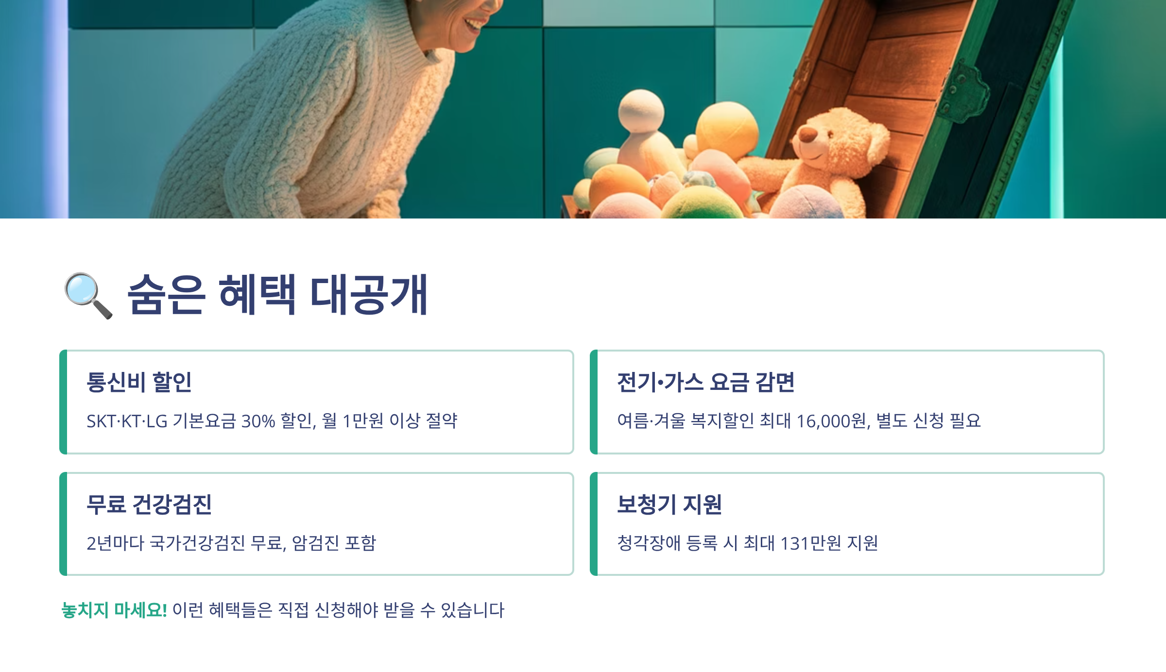 통신비 할인 혜택도 놓치지 마세요. SKT, KT, LG유플러스 등 주요 통신사에서는 만 65세 이상 어르신에게 월 통신비를 최대 30% 할인해주고 있어요. 기본 요금제에서 약 1만 5천 원 정도를 할인받을 수 있으며, 인터넷과 결합 상품을 이용하면 더 큰 할인을 받을 수 있답니다. 연간 20만 원 가까이 절약할 수 있는 혜택이에요.
