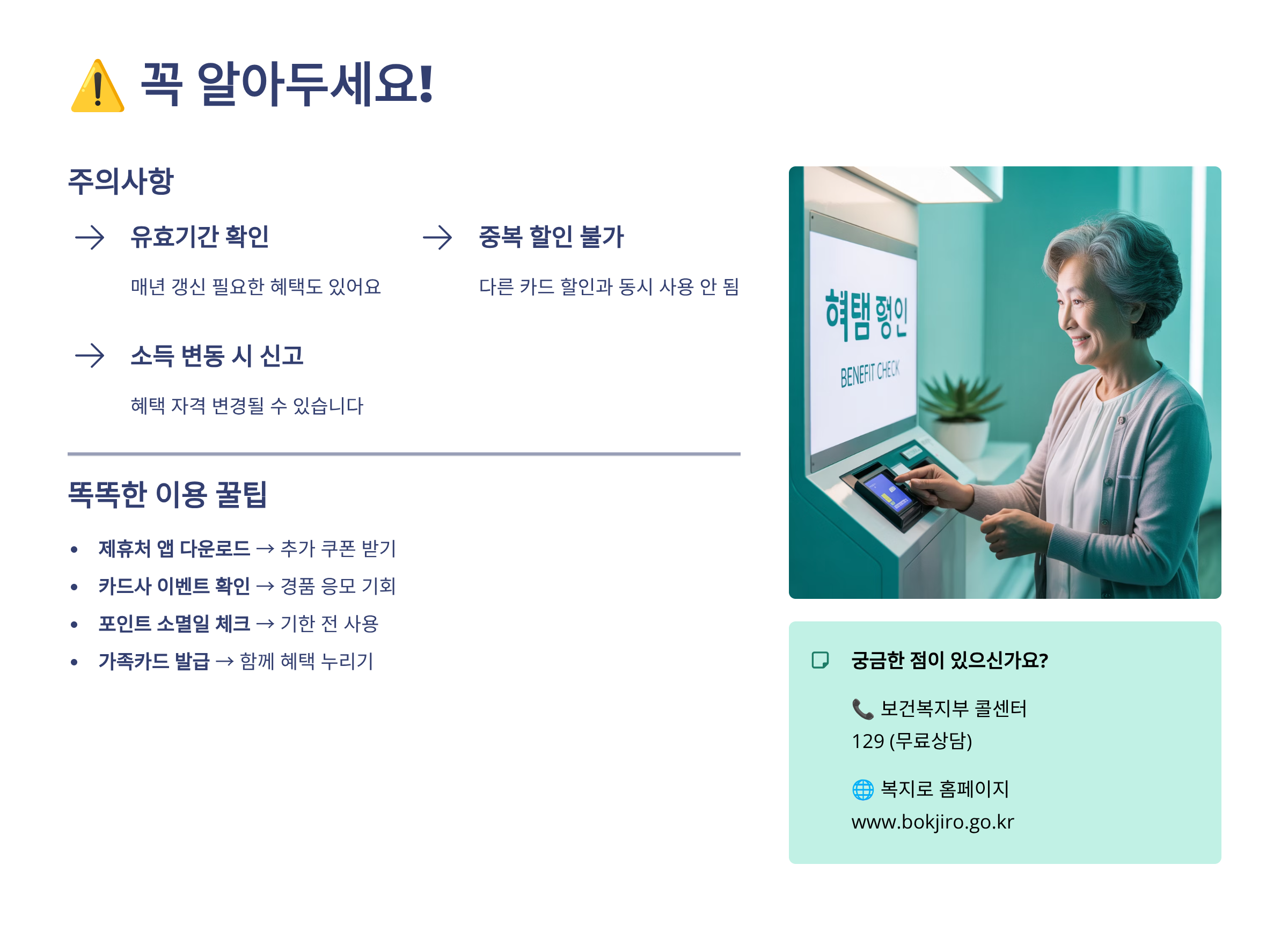 이러한 주의사항들을 잘 지키면서 노인복지카드를 안전하고 효율적으로 사용하시면 정말 많은 혜택을 누릴 수 있어요. 궁금한 점이 있으면 언제든지 주민센터나 카드사에 문의하세요. ⚠️