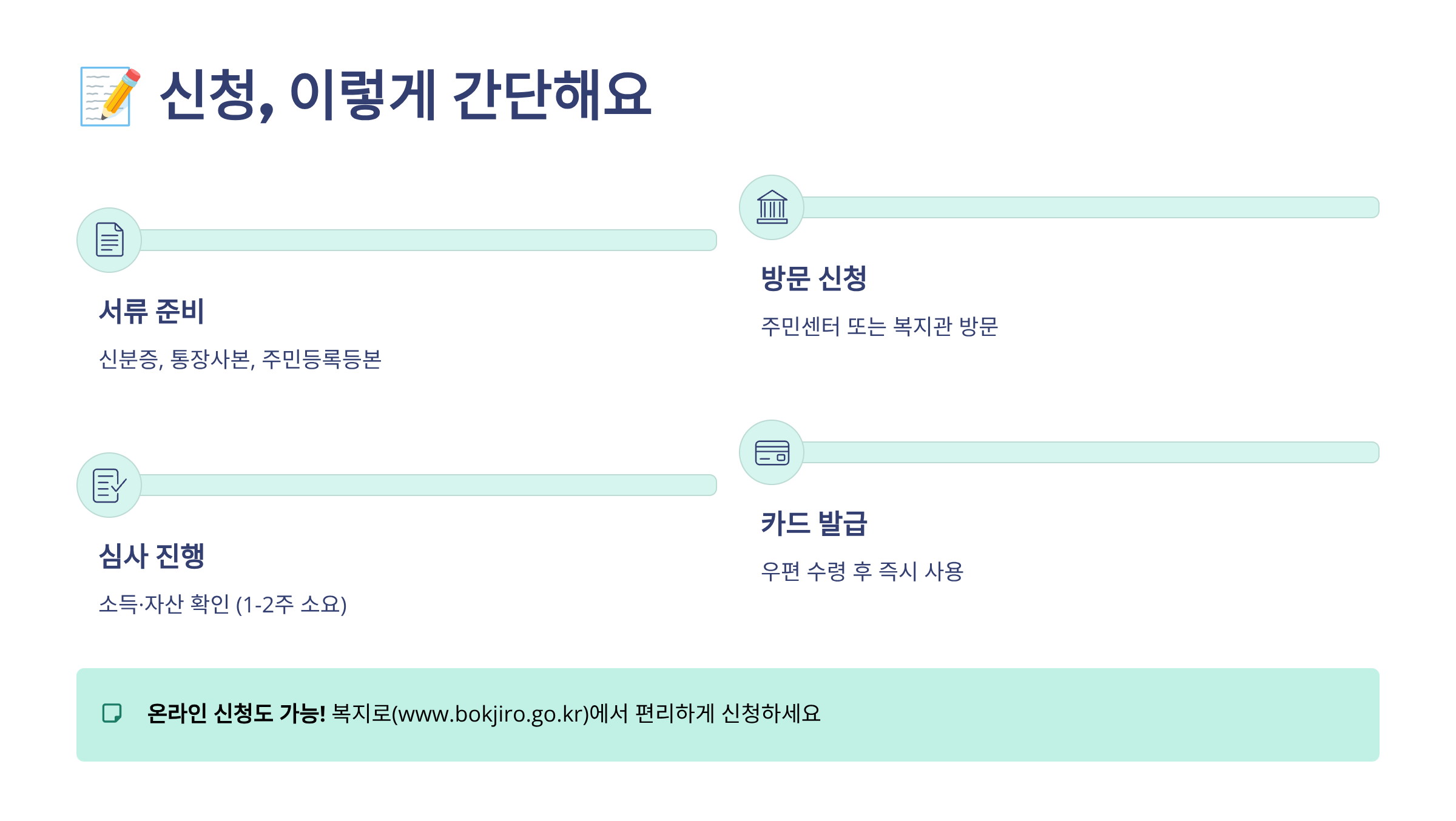 단계별로 차근차근 진행하면 어렵지 않게 카드를 발급받을 수 있어요. 궁금한 점이 있으면 주민센터 담당자에게 언제든지 문의하시면 친절하게 안내해 준답니다. 📝