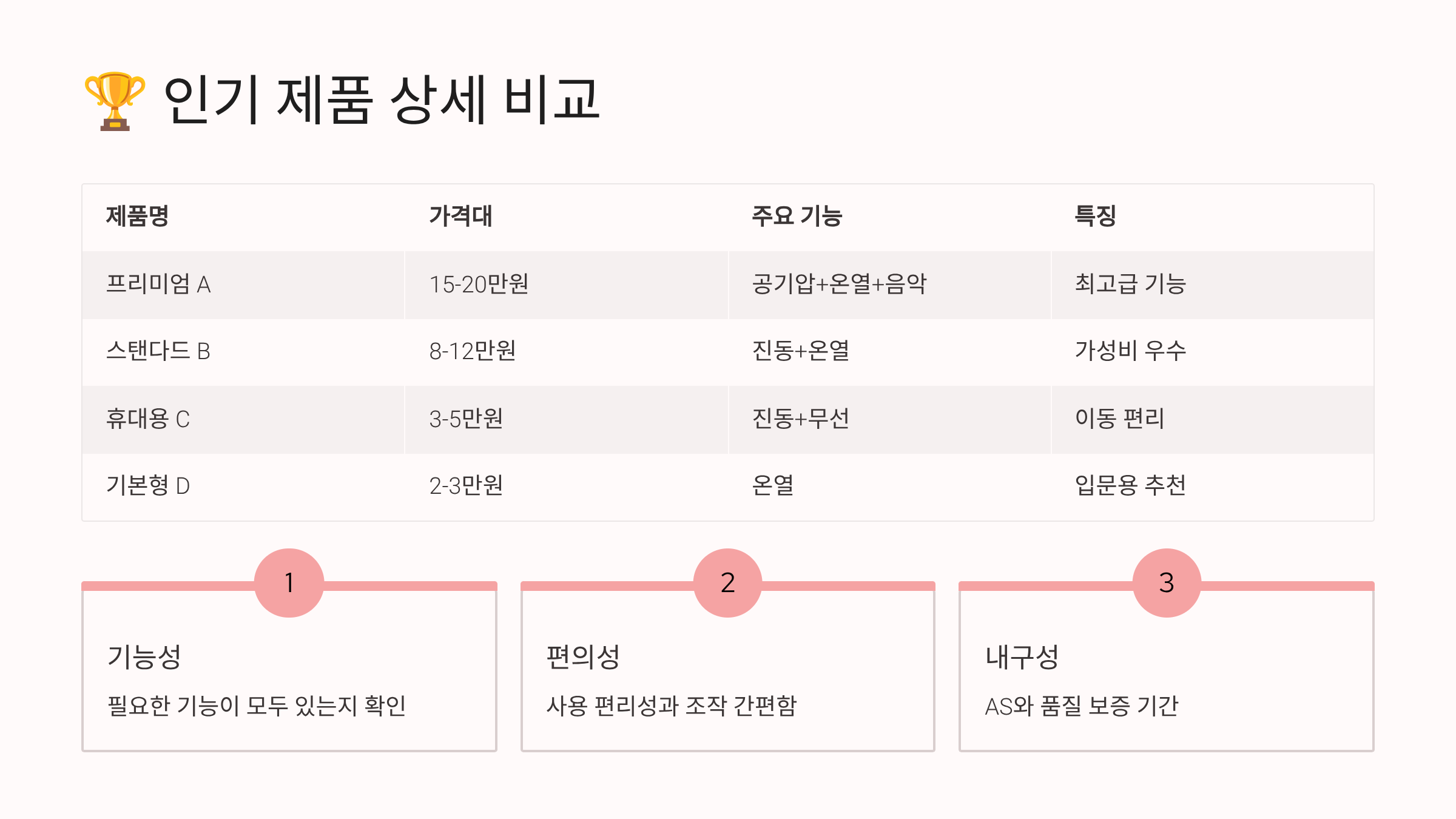 고장 증상별 대처법도 알아두면 유용해요. 전원이 안 켜질 때는 충전 상태를 확인하고 리셋 버튼을 10초간 눌러보세요. 온열 기능이 약해졌다면 발열부에 먼지가 쌓였을 가능성이 있으니 청소해 주세요. 진동이 약해졌다면 모터 부분에 이물질이 끼었을 수 있어요. 소음이 커졌다면 나사가 풀렸거나 부품 마모일 수 있으니 AS 센터에 문의하세요. 자가 수리는 보증이 무효화될 수 있으니 주의하세요! 🔨