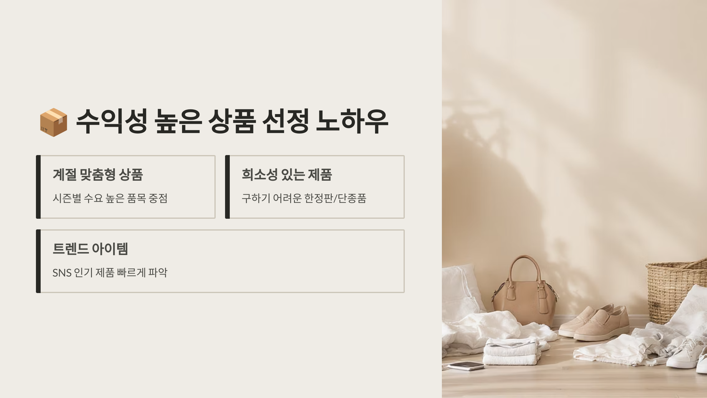 월 50만 원을 넘어서 더 큰 수익을 올리려면 체계적인 확장 전략이 필요해요. 먼저 취급 품목을 다양화하세요. 한 가지 카테고리에만 집중하면 시장 변화에 취약해질 수 있어요. 계절상품, 트렌드 상품, 스테디셀러를 적절히 조합해서 포트폴리오를 구성하면 안정적인 수익을 낼 수 있답니다. 예를 들어 여름에는 선풍기와 에어컨을, 겨울에는 난방기구를 주력으로 하면서도 사계절 내내 팔리는 전자제품이나 생활용품도 함께 취급하는 거예요.