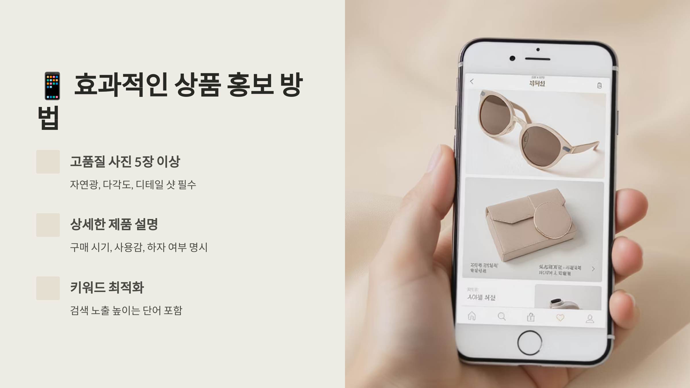 사진이 정말 중요해요. 첫 번째 사진이 썸네일이 되기 때문에 가장 예쁘고 깔끔한 사진을 메인으로 설정하세요. 자연광에서 촬영하고, 배경은 깔끔하게 정리해 주세요. 다양한 각도에서 10장 정도 촬영해서 제품의 상태를 상세히 보여주는 것이 좋아요. 브랜드 로고나 정품 인증 태그, 구매 영수증 같은 것도 함께 찍어두면 신뢰도가 높아진답니다.