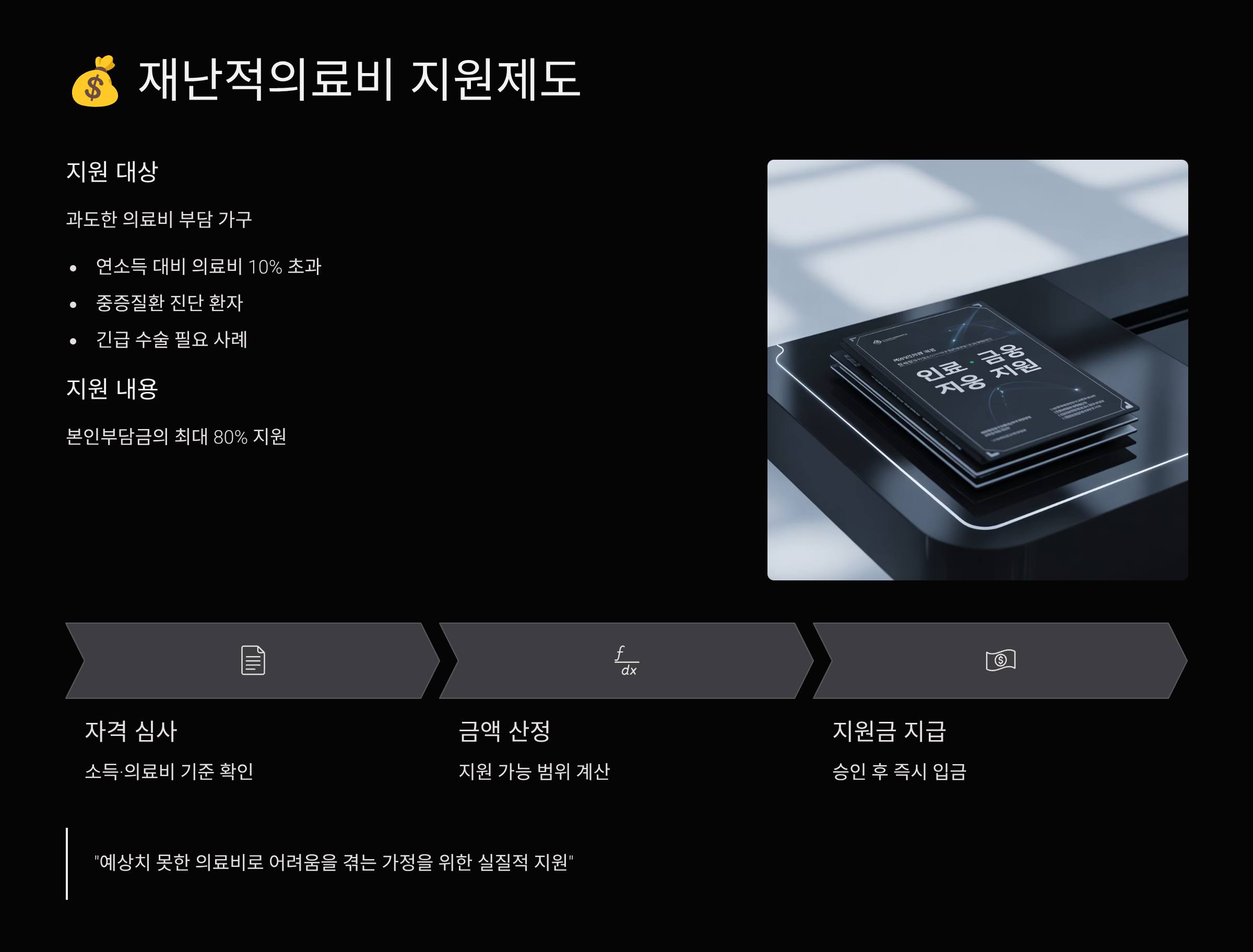 재난적 의료비 지원사업은 과도한 의료비로 경제적 어려움을 겪는 가구를 돕는 제도예요. 연간 의료비가 가구 소득의 15% 이상 발생한 경우 최대 5,000만 원까지 지원받을 수 있답니다. 특히 중증질환으로 고액의 의료비가 발생한 경우 큰 도움이 돼요. 💊