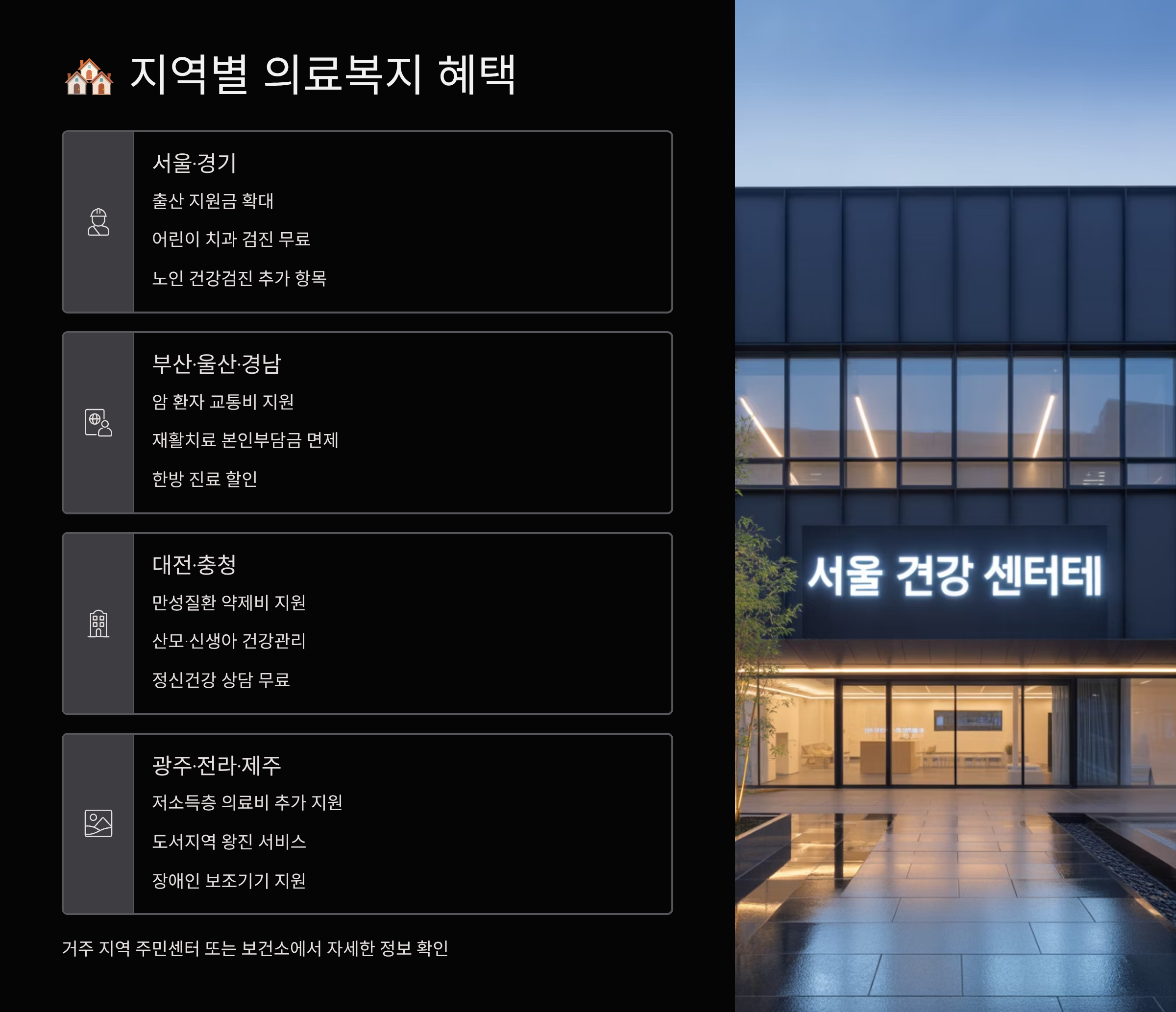 각 지자체마다 독자적인 의료복지 사업을 운영하고 있어요. 서울시의 경우 '서울형 긴급복지'로 기준 중위소득 85% 이하 가구에 최대 500만 원의 의료비를 지원하고 있답니다. 경기도는 '무한 돌봄 사업'으로 위기가정에 의료비와 생계비를 함께 지원하고 있어요. 🏛️