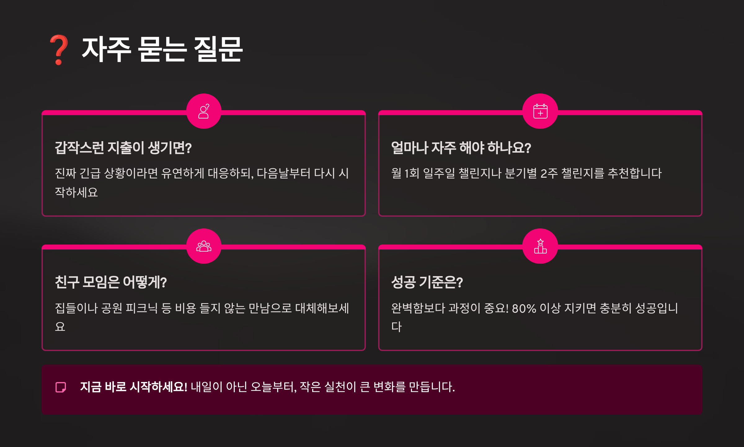 A4. 챌린지 후 보상 심리로 과소비하는 것을 막으려면 점진적으로 일상으로 복귀해야 해요. 챌린지 종료 후 일주일은 '반(半) 무지출'을 유지하고, 그다음부터 조금씩 소비를 늘려가세요. 챌린지를 통해 배운 소비 습관은 계속 유지하면서, 월 예산을 정해 계획적으로 소비하는 습관을 들이면 리바운드를 방지할 수 있어요.