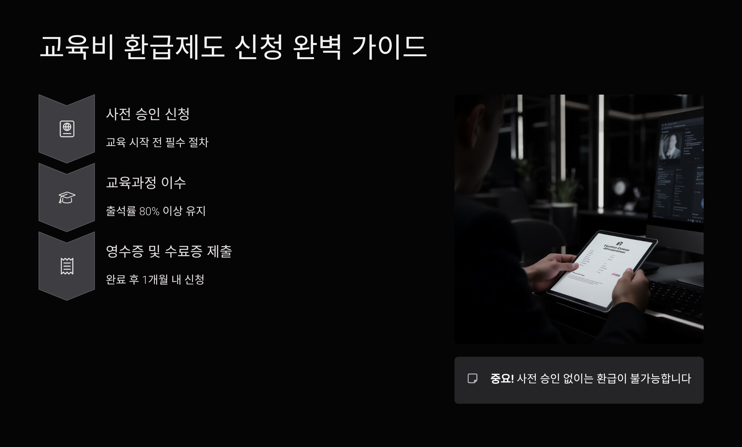 교육비 환급을 받으려면 출석률이 중요해요. 전체 수업의 80% 이상 출석해야 환급이 가능하답니다. 온라인 강의의 경우 진도율 80% 이상을 달성해야 하고, 일부 과정은 평가를 통과해야 해요. 수료 후에는 자동으로 환급 처리되니 별도 신청은 필요 없어요.