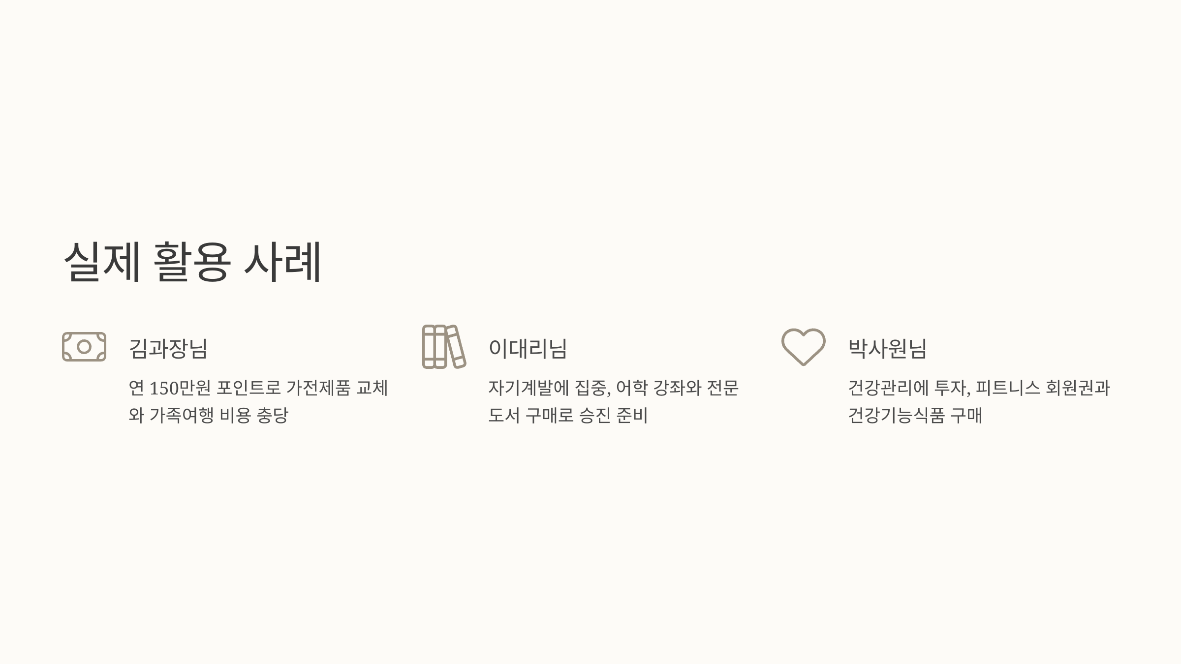 H 씨(40세, 대기업 근무)는 복지포인트와 마일리지를 연계해서 사용해요. 항공 마일리지를 복지포인트로 구매할 수 있는 플랫폼을 이용해서 해외여행을 다녀요. 복지포인트로 마일리지를 구매하면 현금보다 20% 정도 저렴하게 살 수 있어요. 덕분에 연 2회 해외여행을 가면서도 여행 경비를 크게 절약했답니다! ✈️