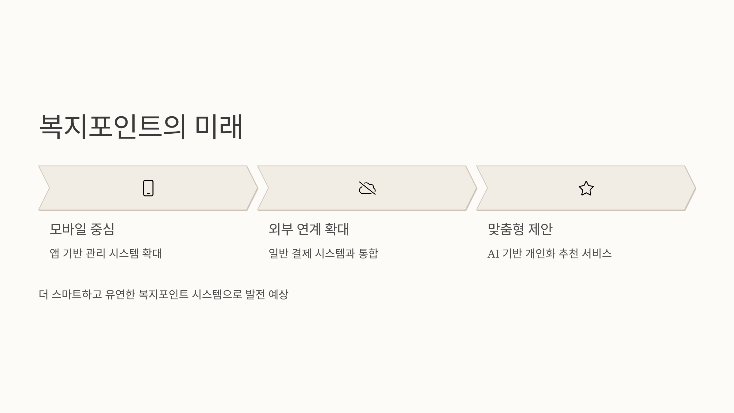 AI와 빅데이터를 활용한 맞춤형 복지포인트 추천 서비스도 등장하고 있어요. 직원의 연령, 가족 구성, 관심사 등을 분석해서 최적의 복지포인트 사용법을 제안해 주는 거예요. 이런 서비스를 통해 복지포인트 활용도가 크게 높아질 것으로 예상돼요.