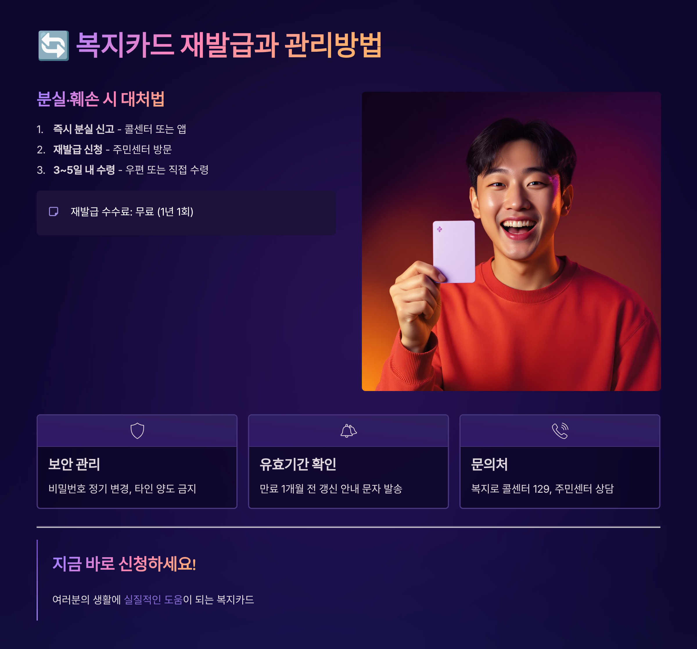 본 글은 2025년 1월 기준으로 작성되었으며, 복지카드 관련 정책과 혜택은 지자체별로 상이하고 수시로 변경될 수 있습니다. 정확한 정보는 해당 지자체 홈페이지나 복지로(www.bokjiro.go.kr)에서 확인하시기 바랍니다. 개인의 상황에 따라 적용되는 혜택이 다를 수 있으므로 신청 전 자격 요건을 반드시 확인하세요.