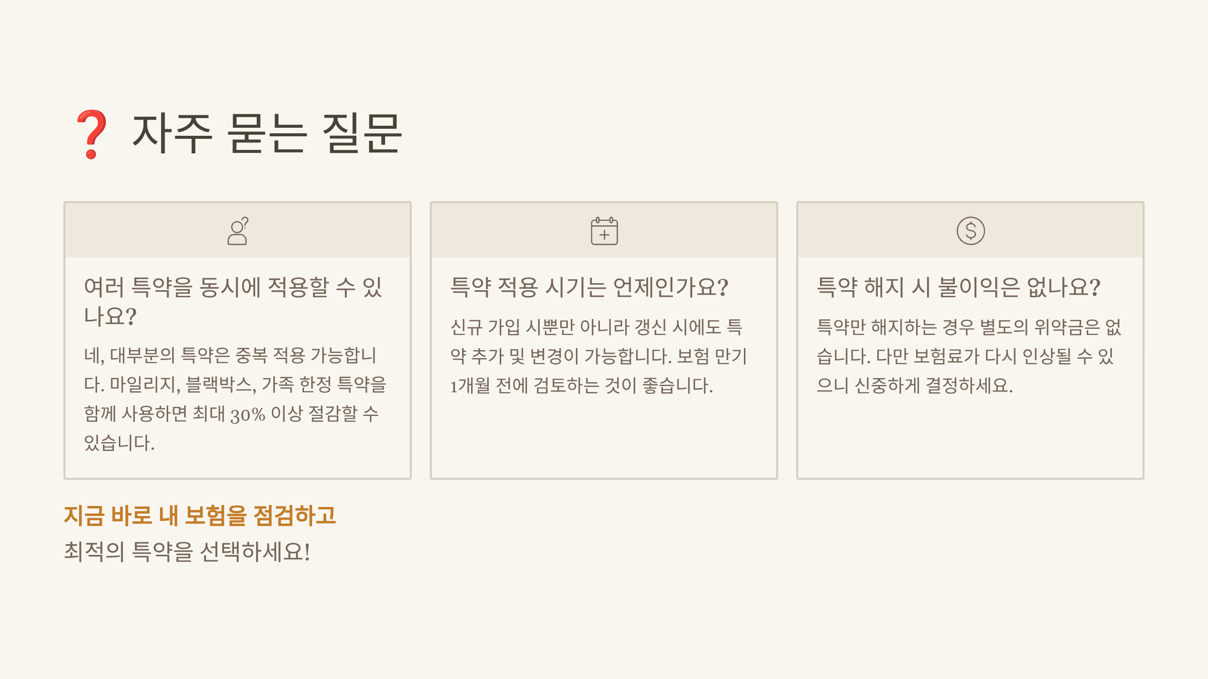 A7. 대부분의 할인 특약은 무료예요! 오히려 보험료를 절감해 주는 역할을 하죠. 다만 일부 보장 확대 특약(렌터카 특약, 대리운전 특약 등)은 소액의 추가 보험료가 필요할 수 있답니다.