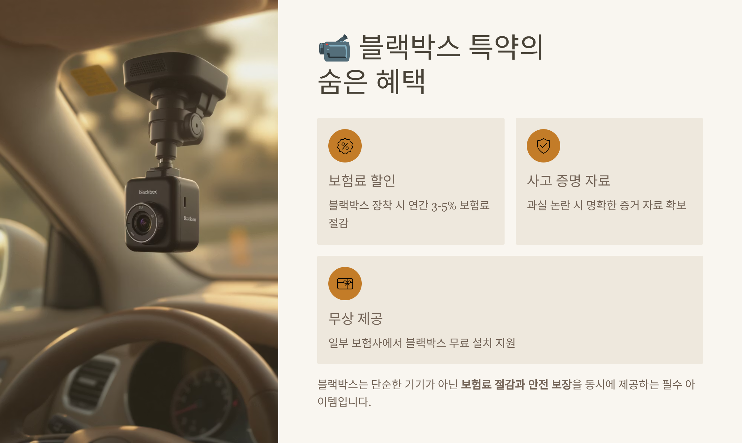블랙박스 특약은 단순히 3~5% 할인만 받는 것이 아니에요. 블랙박스를 장착하면 사고 시 과실 비율 산정에서 유리한 위치를 차지할 수 있고, 보험사에서 제공하는 다양한 부가 서비스도 받을 수 있답니다. 특히 2025년부터는 AI 기반 블랙박스가 도입되면서, 위험 운전 패턴을 미리 감지하고 경고하는 기능까지 추가되었어요. 이런 스마트 블랙박스를 사용하면 추가로 5~7% 할인을 받을 수 있답니다.