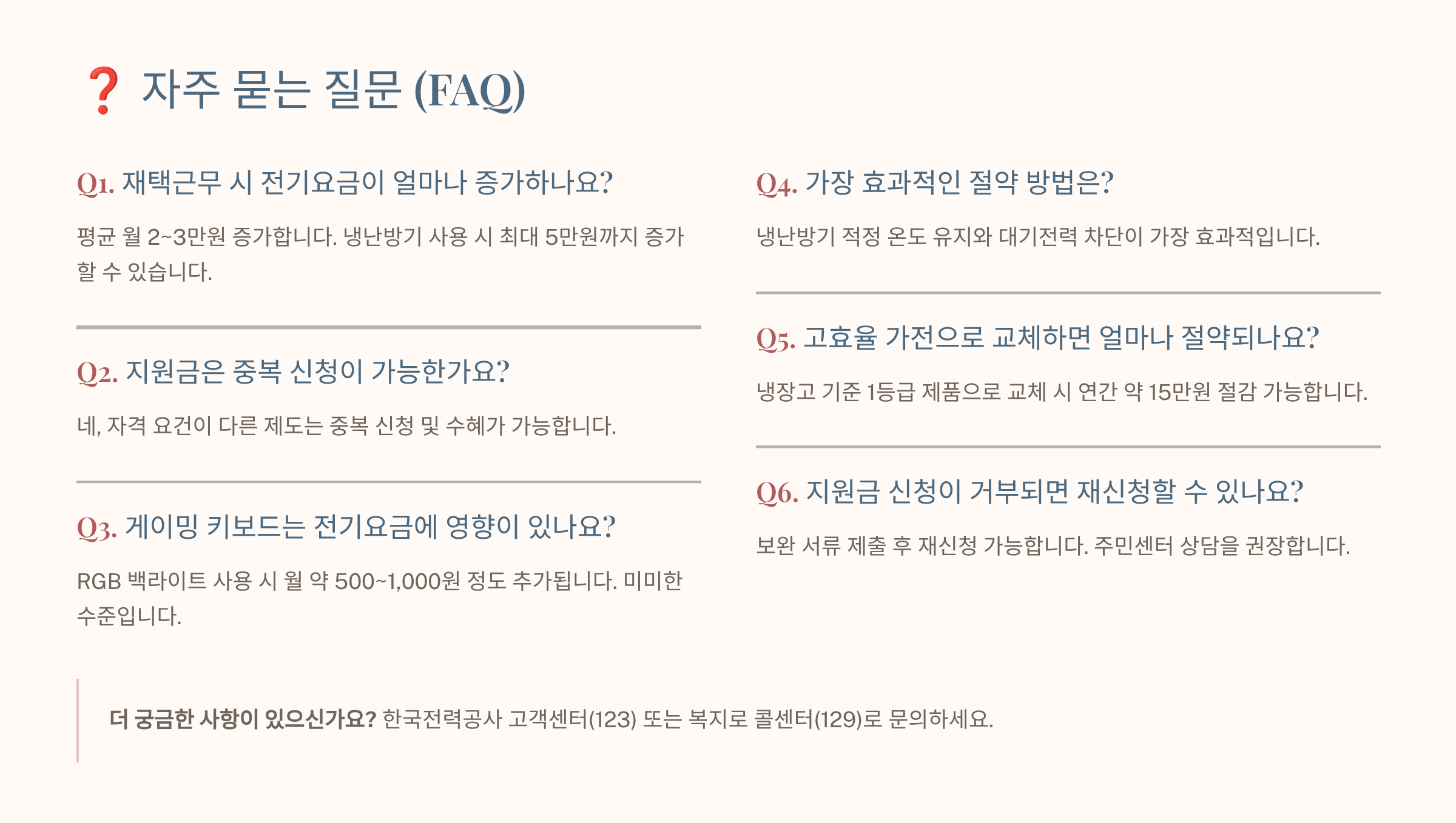 2025년부터 시행되는 재택근무자 전기요금 지원제도가 대폭 확대되었어요. 기존에는 대기업 직원들만 받을 수 있었던 혜택이 중소기업과 프리랜서까지 확대되었답니다. 월평균 2만 원에서 최대 5만 원까지 지원받을 수 있게 되었는데, 신청 방법이 생각보다 간단해요. 한국전력공사 홈페이지나 정부 24를 통해 온라인으로 신청 가능하고, 재택근무 확인서만 있으면 돼요.