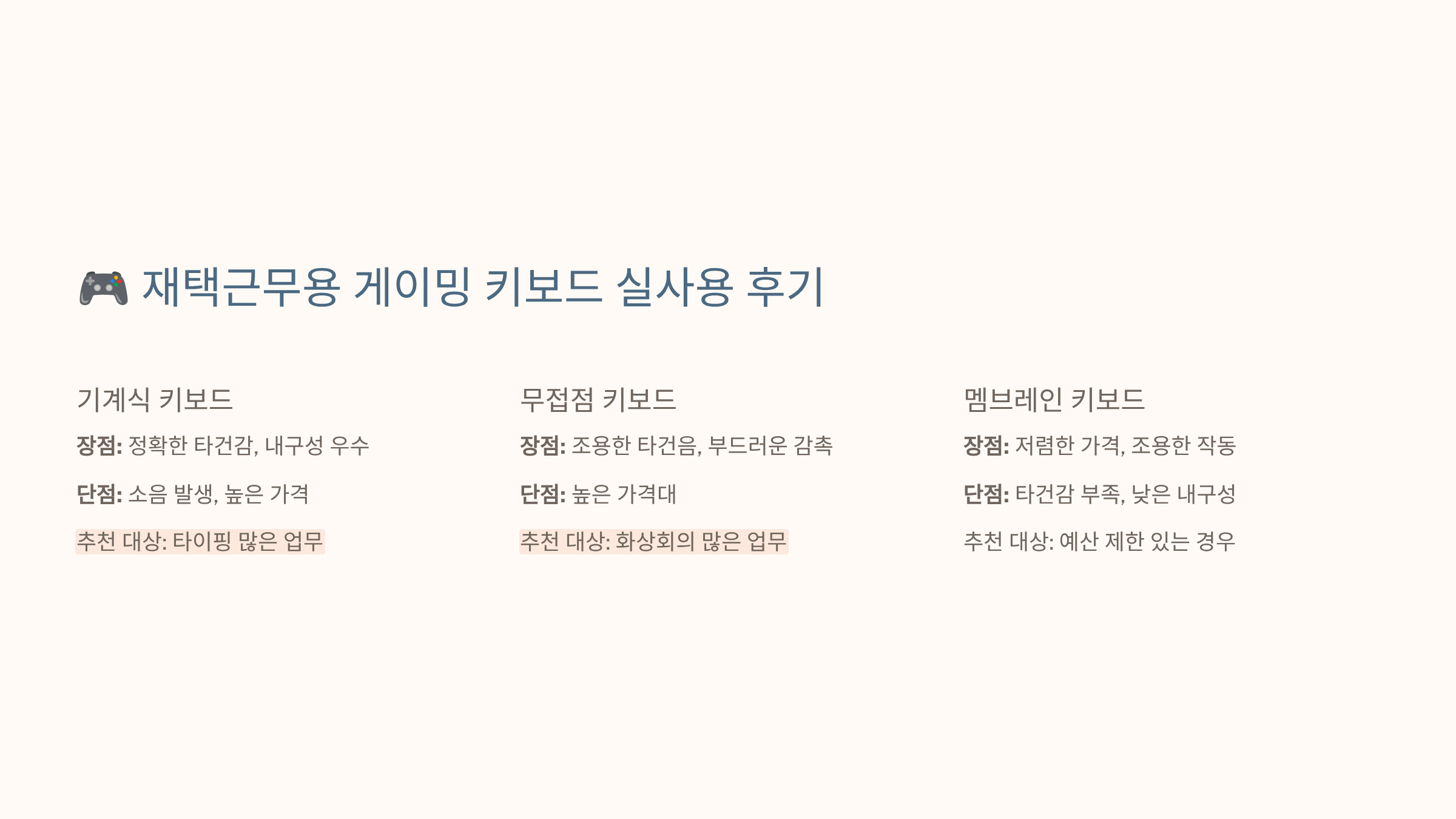 내가 생각했을 때 재택근무용 키보드 선택에서 가장 중요한 건 소음과 타이핑 피로도예요. 화상회의가 많다면 적축이나 갈축을 추천하고, 타이핑이 많다면 청축보다는 저소음 스위치를 선택하는 게 좋아요. 또한 손목 받침대는 필수로 구매하세요. 2만 원 투자로 손목 건강을 지킬 수 있답니다.