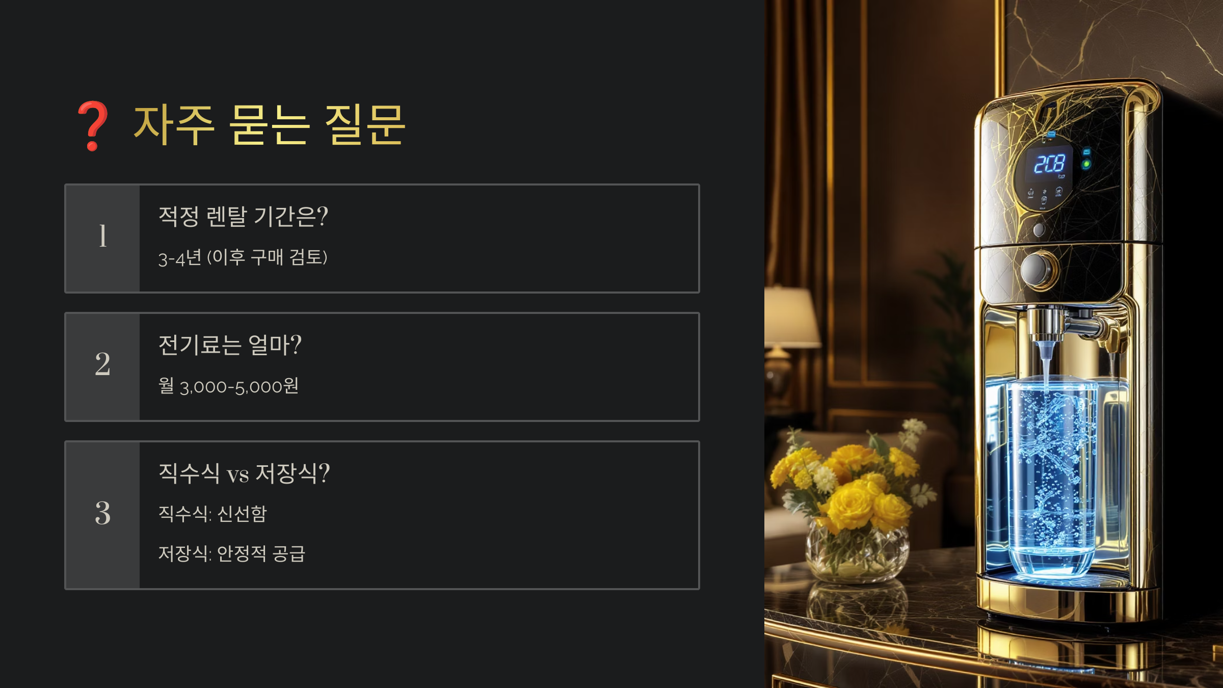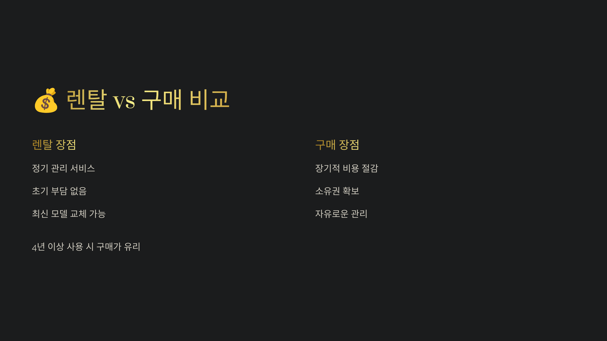 최근에는 렌털과 구매의 장점을 합친 '렌털 후 소유권 이전' 상품도 나왔어요. 일정 기간 렌탈료를 내면 소유권이 고객에게 넘어가는 방식이죠. 초기 비용 부담 없이 시작해서 나중에는 내 것이 되니 일석이조예요. 다만 총비용은 일반 구매보다 비싸고, 중도 해지가 어렵다는 단점이 있으니 신중하게 선택해야 해요.