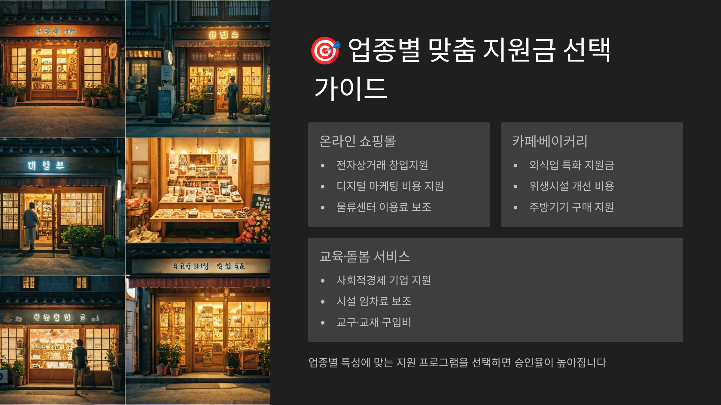 창업 업종에 따라 받을 수 있는 지원금이 달라요. 온라인 쇼핑몰을 운영하려는 주부님들에게는 '온라인 수출 지원사업'이 제격이에요. 아마존, 이베이 등 해외 플랫폼 입점 비용과 마케팅 비용을 최대 2천만 원까지 지원받을 수 있답니다. 영어가 부담스럽다면 번역 지원 서비스도 제공돼요!
