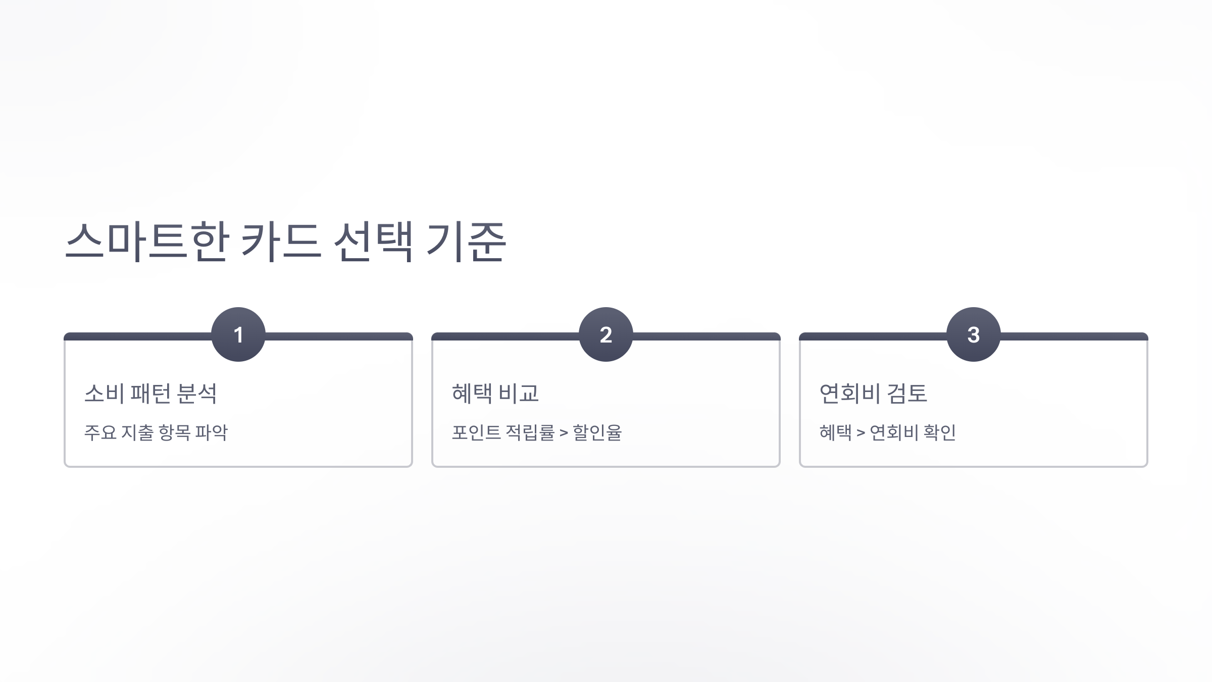 나의 생각으로는 카드 선택에서 가장 중요한 건 '실제로 사용할 혜택'인지 판단하는 거예요. 예를 들어 항공 마일리지 적립이 좋다고 해도 해외여행을 자주 가지 않는다면 별 의미가 없겠죠? 자신의 라이프스타일에 맞는 혜택을 제공하는 카드를 선택하는 게 핵심이에요.