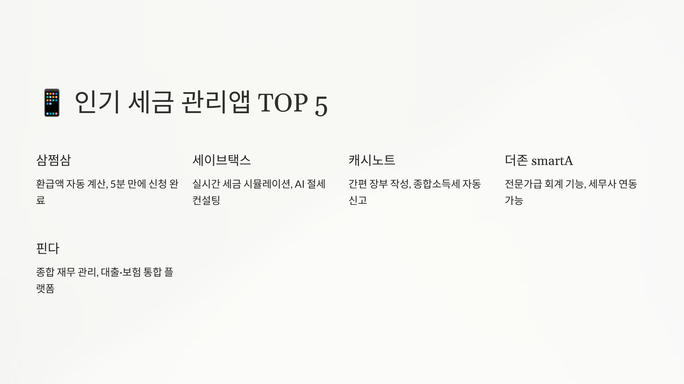 2025년 현재 프리랜서들 사이에서 가장 인기 있는 세금 관리앱 5개를 소개해드릴게요. 각 앱마다 특징이 다르니까 본인의 업무 스타일과 필요에 맞는 앱을 선택하시면 돼요. 저는 여러 앱을 직접 써보고 주변 프리랜서들의 후기도 들어봤는데, 각각 장단점이 확실히 있더라고요.