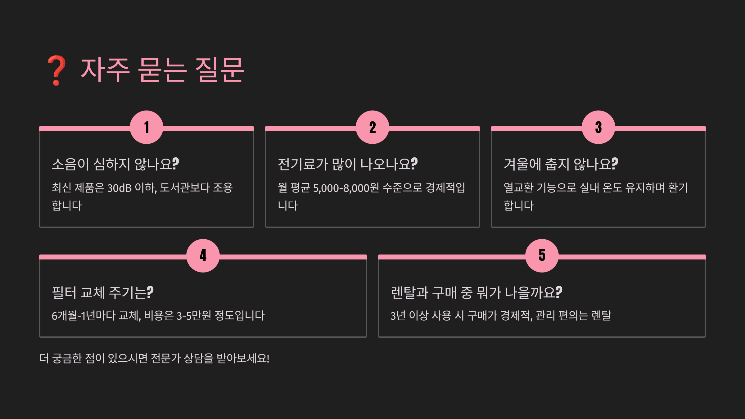 아홉째, 기술은 빠르게 발전하지만 기본적인 환기 원리는 변하지 않아요. 지금 좋은 제품을 사면 5~10년은 충분히 사용할 수 있어요. 오래 쓸수록 투자 대비 효과가 커지니, 결정을 미루는 것보다 빨리 시작하는 게 이득이에요.